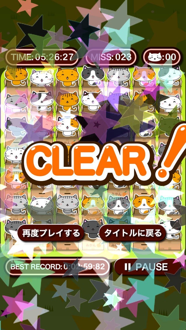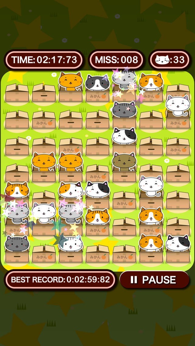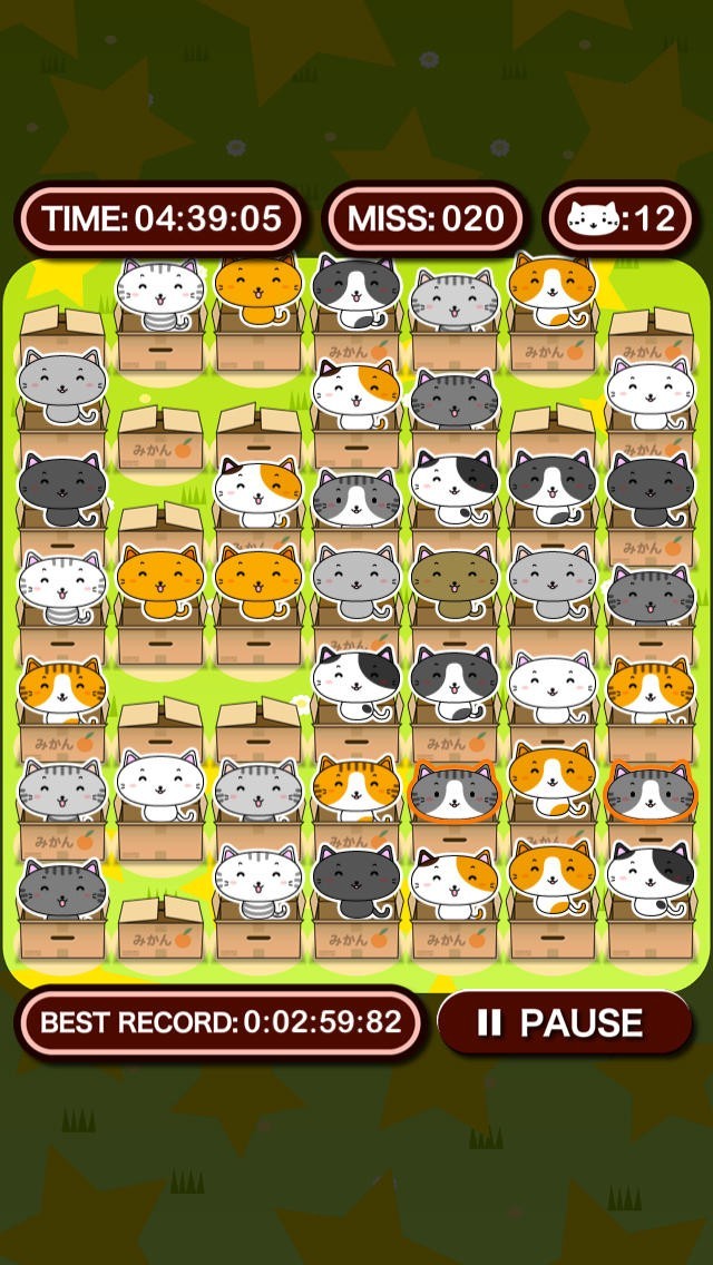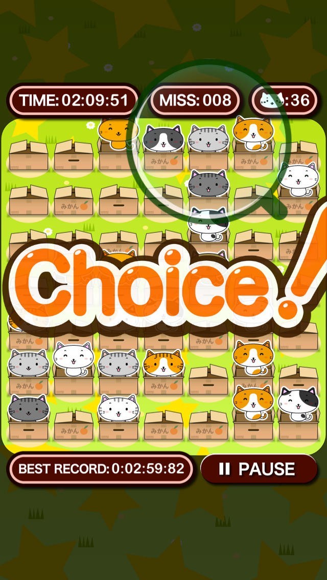 可愛いイラストの猫を使った神経衰弱、それがこのアプリ「ねこ探!」です。ルールは簡単、タップすると現れるねこ達の場所を覚えて同じ模様のねこを3匹揃えていく神経衰弱です。通常の神経衰弱とは違い1回のタッチで5箇所開きます。1ターンで3回タッチできるのでそこから同じ模様のねこを探しましょう。 ねこが隠れているダンボールは全部で49個しかし金のねこを見つけると1回追加で見られるチャンスになります。どれだけ短いいターンで全てのねこを見つけられるのか是非チャレンジしてみてください。