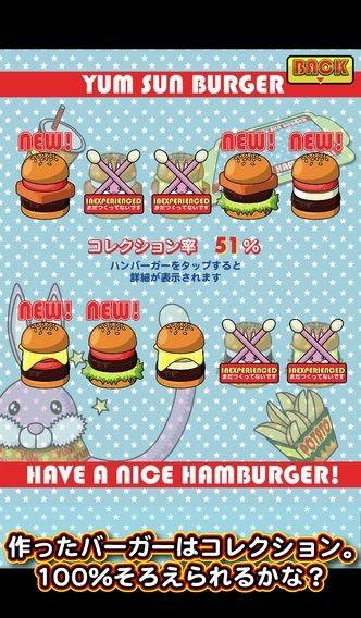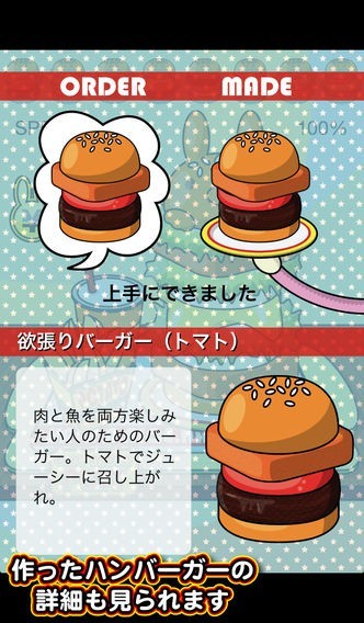 子供から大人まで楽しめるハンバーガー調理ゲームです。様々な種類の具材を組み合わせて素早くハンバーガーを作ります。1度でも作ったハンバーガーは自動的に記録され、いつでもコレクションとして眺められます。