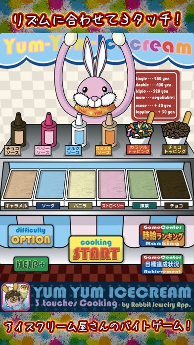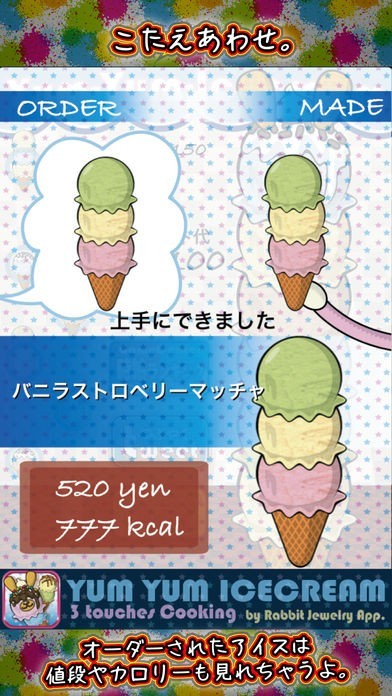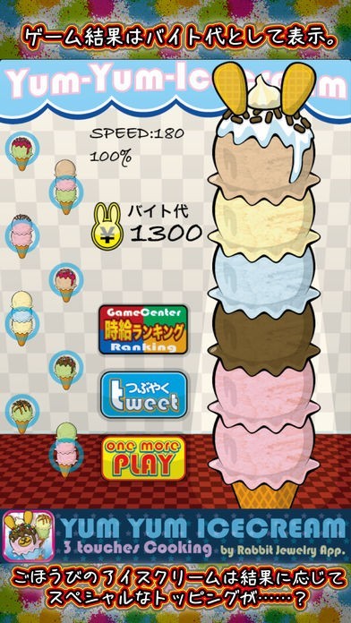 お客さんの注文通りのアイスクリームをつくるゲームです。 カラフルなアイスクリームとトッピングをリズムに合わせタップするだけなので操作は簡単。 できあがったアイスクリームの値段とカロリーも見る事ができ、上手に作れるとバイト代がたくさん貰える上に、ごほうびのアイスクリームをスペシャルなトッピングで豪華にする事もできます! リズムは13段階の速度が選べ、1200円の時給をクリアすると音楽を選ぶ事ができるようにもなるのでやり応えも充分にあります。