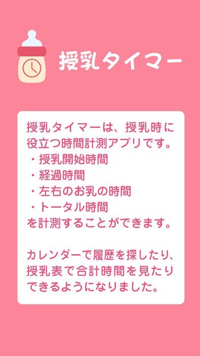 App Storeより引用授乳タイマーは、育児日記をつけて管理しているママに使ってもらいたい、授乳期のママのための「授乳時間計測アプリ」です。