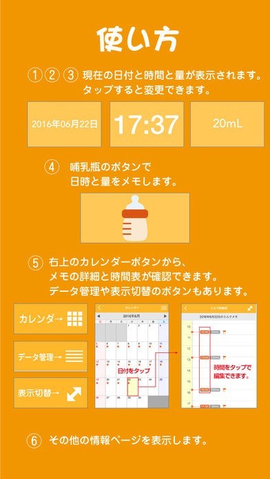 画面をタップするだけで、ミルクをあげた時間、飲ませた量をメモとして保存することができます。カレンダー上で内容が確認できるので、育児日記と連携して子供の成長記録に役立てることができます。