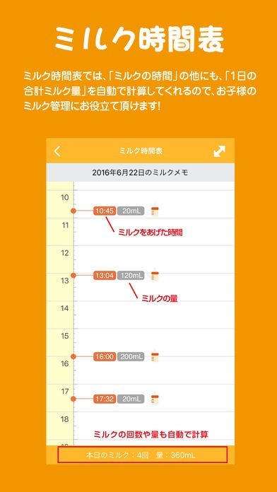 1日の合計ミルク量の計算は自動計算で便利
