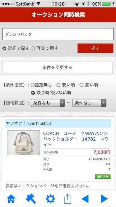 オークションの残り時間が少ない順やアイテムの価格が安い順など、任意の条件で検索したオークションを並び替えすることができるようになっているので、参加したいオークションをすぐに発見できます。