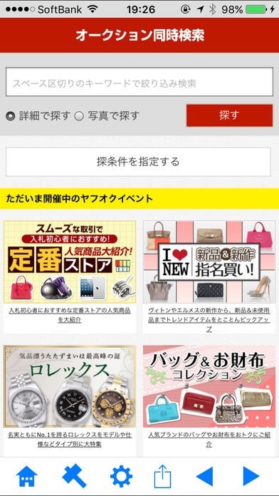 ヤフーオークションと楽天オークションの二つのオークションサイトを同時に検索することができるようになっているので、より条件の良いオークションに参加することができます。