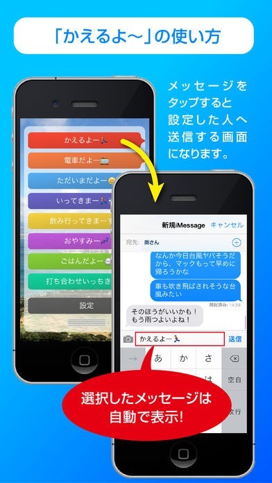 「かえるよ〜」は、毎日よく使うメッセージ定型文をあらかじめ登録して、SMS・iMessageなどで利用できる、定型文登録/送信アプリです。