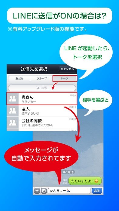 アップグレードを購入いただくことでメッセージの登録数制限がなくなり、LINEへ送る機能も利用できます。