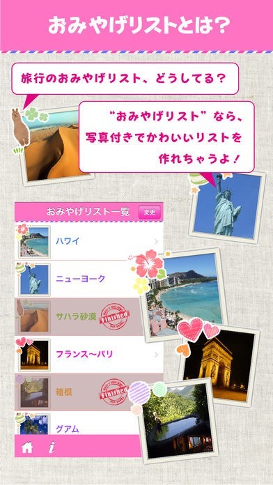 おみやげリストには写真を登録しておけるので、旅行でのおみやげ探しの時も買うものが分かりやすくて便利です。また、買い終わったリストにはfinishマークをつけることで区別しやすくなっています。