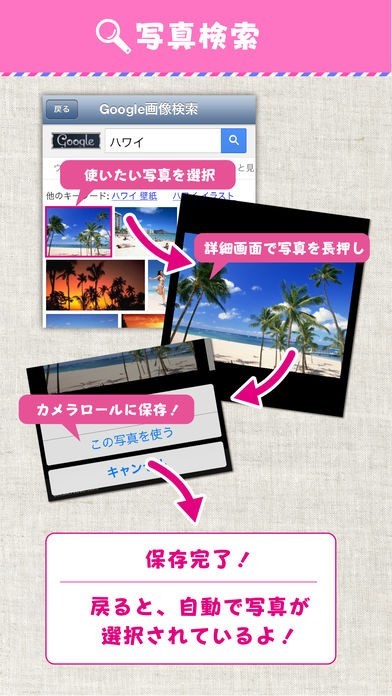 Google画像検索と連携されているので、リストに挿入する画像をアプリから検索してダウンロードして使用することができます。他にも、カメラで撮影した写真を挿入することも可能です。