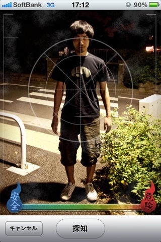 幽霊探知のやり方は簡単。ここぞと思う場所で「探知」ボタンを押すことで、ばけたんがその場の状態をサーチし、そこに存在するであろう幽霊・おばけ(=未知のエネルギー体)を検出し、「青・青緑・緑・黄・赤」の5色のカラーで表示します。