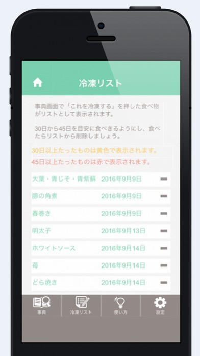 事典詳細画面で、「これを冷凍する」ボタンを押すと、冷凍したものと日付が冷凍リストに追加されます。