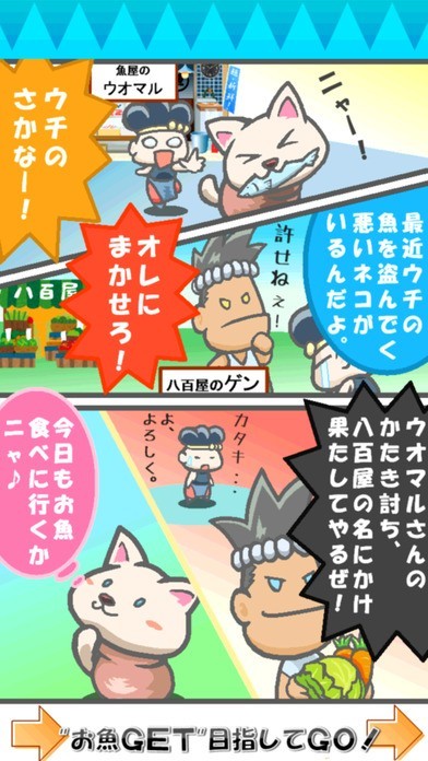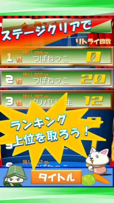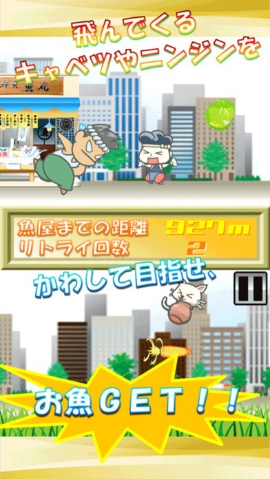 「つぼねこダッシュ!」は、壺に入った猫を操り、魚屋さんを目指して進む横スクロール型アクションゲームです。八百屋が投げるキャベツやニンジンを上手に避けながら進む必要があり、画面タップによるジャンプ、長押しでのローリングの使い分けがステージ攻略へのポイントとなるでしょう。障害物に触れるとゲームオーバーになってしまうため、投げられた野菜を咄嗟に避ける判断力も必須となっています。リトライを繰り返しながらやり込めば、長めの休憩時間や休日の暇つぶしとしても活躍してくれます。また、ランキングでスコアやリトライ回数を競い合って遊べるのも特徴となっています。