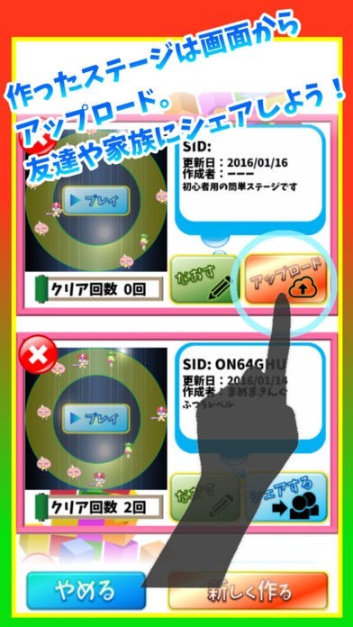 ゲームで遊ぶ以外にも自分でステージを作ることもできるから、作ったステージで友達や家族といっしょに遊んだり、アプリでシェアして楽しめる!