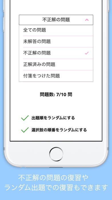 ・復習では出題順や選択肢の表示時のランダム化が可能です