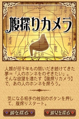 恋人・友人・会社の同僚など、他の人の本心を覗いてみたいと思ったことはないでしょうか。そんな時に使えるのが「腹探りカメラ」です。アプリを開いて、男女どちらを診断するのかを選択します。次に、相手のお腹あたりを写すと胃袋の絵とともに、「絶対ムリ!」などのグサッとくるような本心が書かれたものが写る仕組みになっています。もちろん、あくまでもネタとして選ばれた文言ばかりです。SNSとのシェア機能も搭載されていますので、撮影した胃の写真をアップして友人らの笑いを誘っても楽しいです。またサークルや職場の飲み会で使っても、盛り上がること間違いなしです。