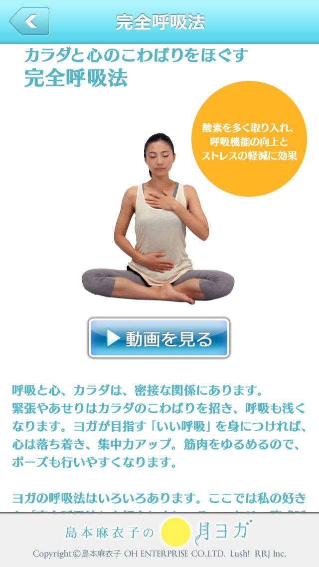 「島本麻衣子の月ヨガ」を使えば、毎日の周期に合わせてヨガのポーズをひとつ教えてくれるので、その日の最適なものを知れるので、一ヶ月続ければ健康になれる可能性が高まります。 また、重要で基礎となる、「完全呼吸法」というすべてに欠かせない技術を身につけることも出来ますので、集中したい時やリラックスがしたい場面で活用することが出来ます。例えば、「蝶のポーズ」などというものを紹介してくれて、文字による解説もしてくれて、動画で詳しいやり方を真似ることによって知ることが出来るので、解りやすく把握することができたり、一時停止などを活用することでより細かな指先まで確認可能です。 さらには、「太陽礼拝」などというようなヨガに対する知識を得ることもできたりするので、知識面でも役に立ちます。