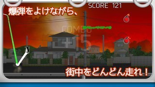 走っている電車の外を人が走る、そんな妄想を楽しむゲームです。外にある人影が建物の上を跳ねながら走るので、跳ねる爆弾をさけましょう。ステージがすすむごとに爆弾の数が増加、あたればゲームが終わります。タイミングよくタップすれば急降下、爆弾の数を確認しつつ、操作するのがゲーム攻略のコツです。爆弾をギリギリで避ければコンボ。途中で登場する緑の先にふれれば、スコアがアップするので、確実にとりましょう。時間はゲームオーバーまで無制限、長く続ければそれだけスコアがあがります。他のプレーヤーと競えるので、スコアをあげましょう。2分~10分程度で気軽に遊べるので、仕事や勉強に疲れた時の息抜きに最適です。