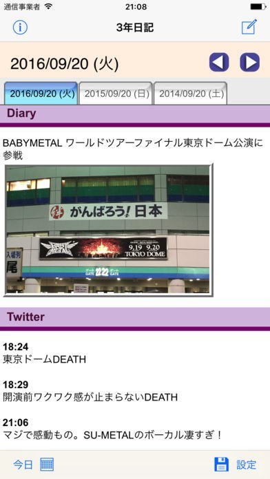 今年、去年、一昨年の同日の日記を3のタブで並べて表示します。記念を見比べてみるのも楽しいですよ。