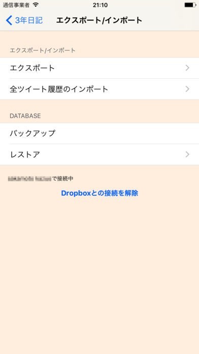 大切な日記のデータは、Dropboxへとバックアップを取ることが可能です。出力されたデータからの復元もカンタンで、このデータにはTwitterのデータも含まれています。