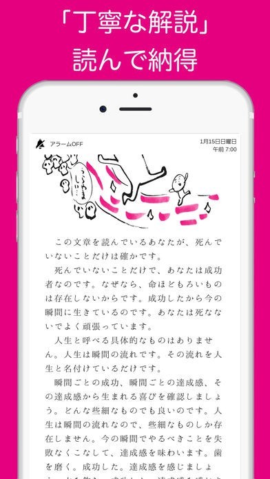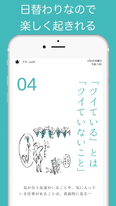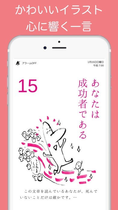 ブッダの教えを毎日スマートフォンで見ながら生活することができるカレンダーアプリが「日めくりブッダの教え-カレンダーと目覚ましアラーム」です。日めくりでアルボムッレ・スマナサーラ長老が書き下ろしたブッダの格言だけでなく、しりあがり寿さんのイラストを添えて閲覧することが可能となっていて、毎日幸せに過ごすための教えを楽しく気軽にチェックすることができます。アラーム機能も搭載していて、アラームを止めるとその日のブッダの教えを閲覧することができるようになっているほか、文字の大きさやアラームの種類、スヌーズの間隔などはカスタマイズすることも可能です。