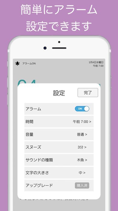 アラーム機能が搭載されていて、アラームを止めるとカレンダーの画像が表示されます。木魚の音などからアラームのサウンドを選ぶことができ、スヌーズの時間も自由に設定可能です。