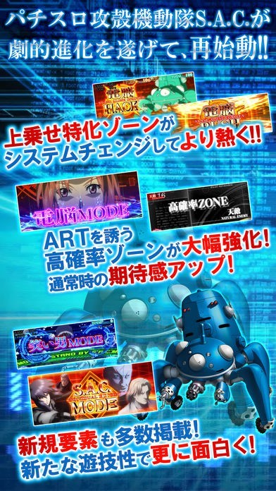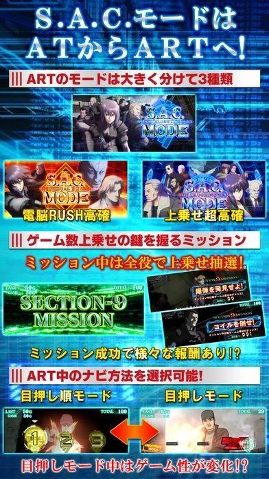 一般的なARTの"S.A.C.MODE"と上乗せ高確ART"電脳RUSH"、更には上乗せ超高確ART"電脳HACK"と3段階で上乗せ確率が上がっていくARTが搭載されています。