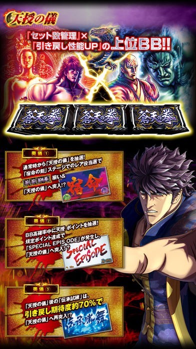 このアプリの魅力は、なんといってもリアルなグラフィックが素晴らしい。蒼天の拳の世界観が演出されているので、原作ファンも納得の仕上がり、登場キャラクターも実機同様なので、実際にパチスロを打っている気分を充分味わえる。