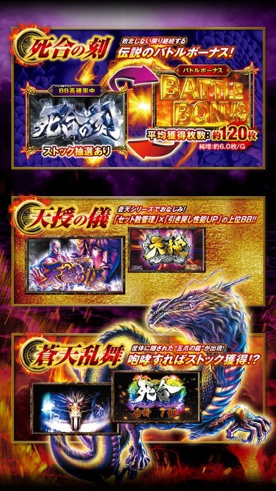 このパチスロアプリの特徴は、敗北しない限り継続し続け、高純増のボーナス死合の刻。敗北したときに突入する32GのST型引き戻しゾーンの伝承試練も、このアプリで再現。パチスロファンにはたまらない演出です。