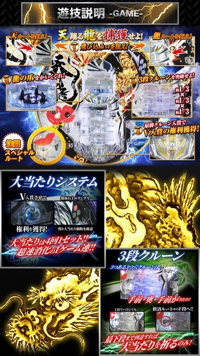 このゲームは、パチンコアプリでは珍しい羽根モノ機種を楽しめます。2つのルート、天ルート・龍ルートを狙い玉が龍の爪を掻い潜ると待望の3段クルーンに突入。新たな世界観を十分楽しめます。