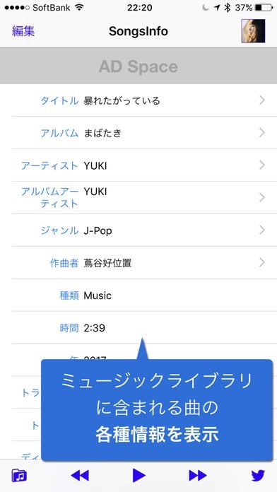 「SongsInfo」は、ライブラリ内の楽曲情報を手軽に確認できるアプリです。 再生回数や最後に再生した日、スキップ回数といった詳細が確認可能。 再生回数などはランキング形式で表示されるため、お気に入りの曲を一目で把握できるのも楽しいポイントとなっています。 歌詞表示機能の他、アートワークの表示機能も搭載しており、アルバムのアートワークを拡大してじっくり眺めることができます。