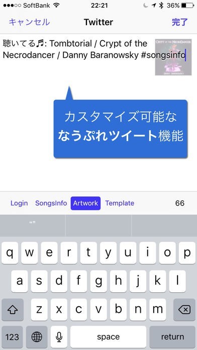 楽曲情報をTwitterへと投稿することができます。ツイート用のテンプレートも作成可能。曲名や再生回数などをツイートすれば、友達と曲に話題で盛り上がることができます。