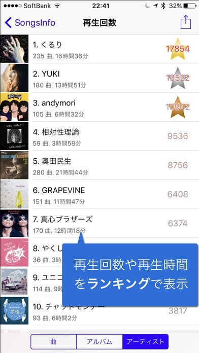 再生回数をランキング形式で表示!ライブラリ内の楽曲情報を確認できる!