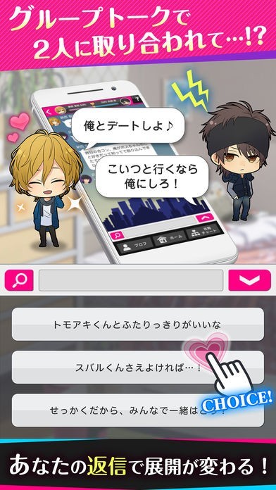 メッセージアプリでの会話はエンディングに影響を及ぼすので、よく考えてから返信しましょう。どのイケメンと恋人同士になれるか、選んだカレとどういった結末を迎えるのか。全てはあなた次第です。