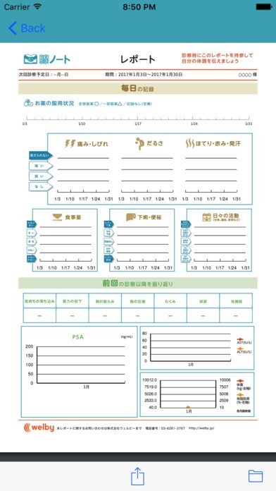 日々の症状や体調などを記録することができる前立腺がん患者向けのアプリです。泌尿器・腎移植科の医師が監修した本格的なアプリになっています。1か月間の症状や体重、検査値などを記録して振り返ることで治療に役立たせることができます。飲んだ薬を記録することもできるので、きちんと飲んだかを確認でき薬の服用管理にもなります。 記録したデータはグラフ化したりレポートとしてまとめることができるので、そのまま診察の時に医師に見せることもできます。