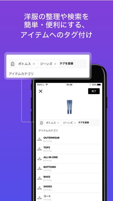 - 撮影した洋服に対して、自由な"タグ"をいくつでも付けて、検索・整理できます。