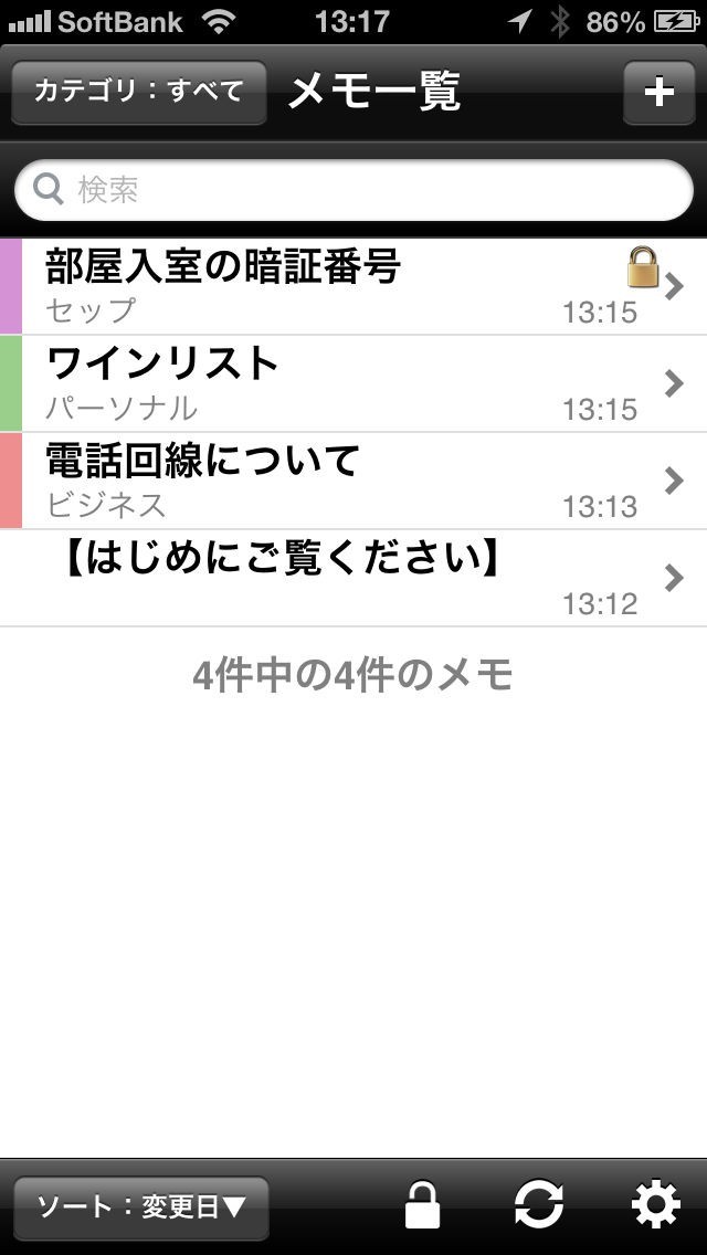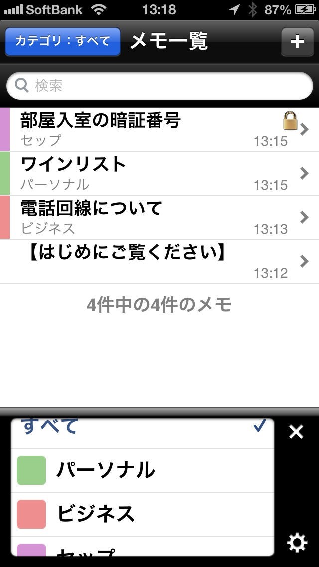 各メモは、「カテゴリ」ごとに分類でき、「カテゴリ」ごとの表示も可能です。