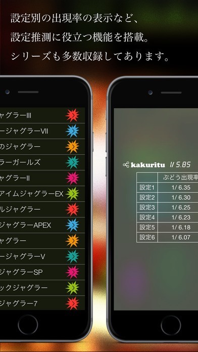 App Storeより引用パチスロのジャグラーにおける、ぶどうカウントの為のツールです。ぶどうのカウントとゲーム数から当選率と設定期待度を算出します。