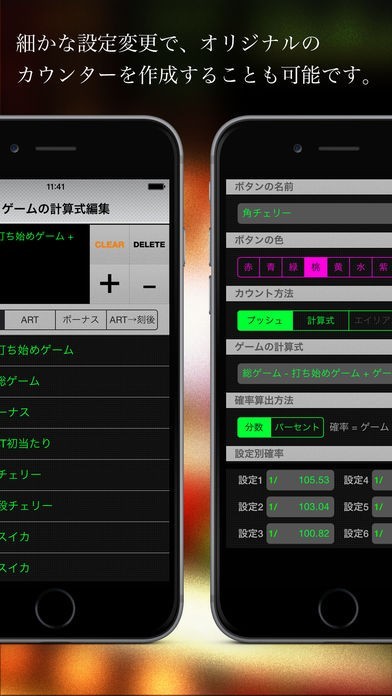 App Storeより引用パチスロ用の小役カウンターです。小役のカウントから、総合的な判別ができる設定判別ツールを搭載した本格派仕様となっています。【目的】パチスロにおける小役やボーナス等をカウントすることで、設定を推測します。【主な機能】・試行回転数、役の当選回数、役出現率から設定を推測し、パーセント表示。・推測した設定期待度をグラフで表示・オリジナルカウンター作成機能・サンプルカウンターのダウンロード・カウンターを履歴に登録できる機能・リアルタイムでボタンごとの当選確率を表示する機能・カウント時にはボタンの回転と「ピッ」という音でカウントしたことを知らせます・カウント時バイブレーション ON/OFF機能【注意事項】・表示される確率はあくまで目安であり、必ずしもこの割合であることを保証するものではございません。・このアプリを使用したことによるいかなる損害も保証しかねますので、ご了承ください。