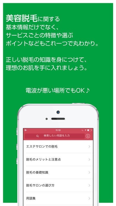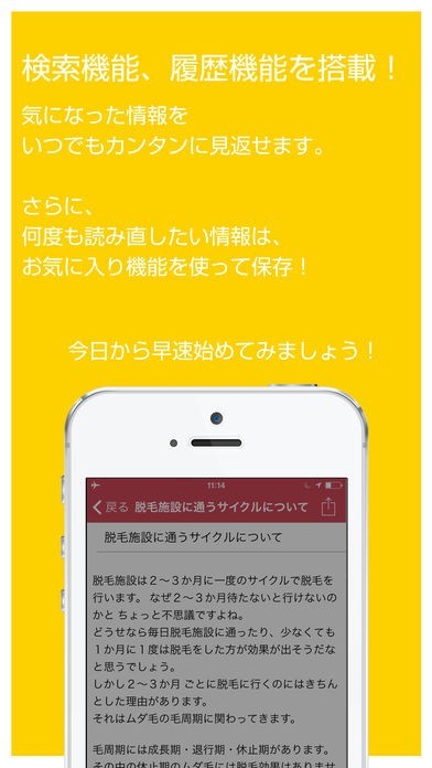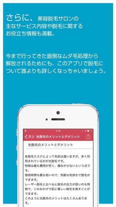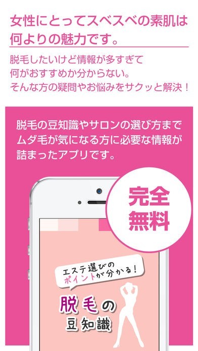 このアプリには、なかなか人には聞けない脱毛の豆知識や、脱毛施設の選び方まで、ムダ毛が気になる人に必要な情報が詰まっています。