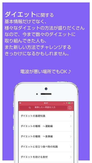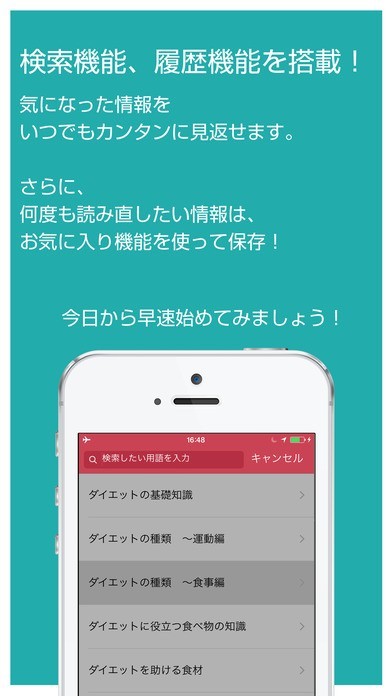 ダイエットを始めてみたいけれどどうすればよいのかが全く分からない!という方に向けてのアプリが「ダイエットの基礎」です。どういった食事や運動がよいのかということや、リバウンドを防ぐためのコツなどダイエットを始める方ならぜひ知っておきたい情報が盛りだくさんです。初めてのダイエットに取り組む方はもちろん、自己流のダイエットの方法を見直したいと考えている方にとっても役立ちます。また、便利なお気に入り機能を活用すれば気に入ったコラムを保存してすぐに読み返すことができるようになります。内容を暗記するまで、何度も読みたいと思った時に便利な機能です。