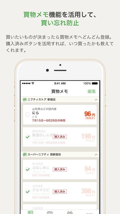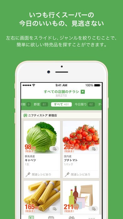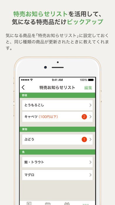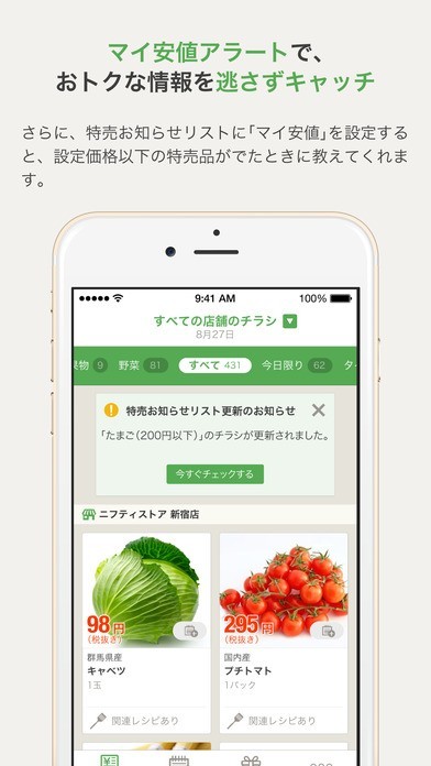 全国に数あるスーパーの広告をアプリで見られるようになりました。最近では新聞もとっておらず、広告を目にすることがほとんどない方も多いはず。そんな人もアプリから全国どこのスーパーの広告でも見れるのです。節約上手な主婦の方ならば一番安いお店で買いたいと思うはずです。でも毎日の買い物でいちいち広告を見て店を選ぶのも面倒ですね。このアプリでは気になる商品の価格が欲しい価格以下になったときにだけ通知してくれる機能もありますので、お店の選択の手助けにもなります。