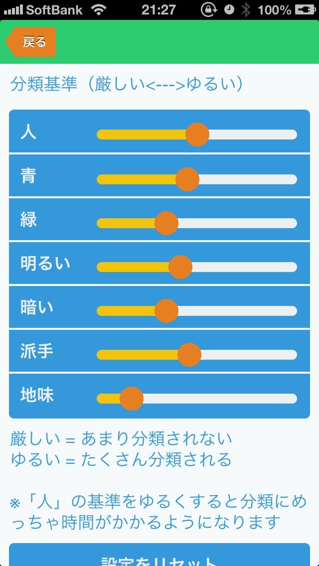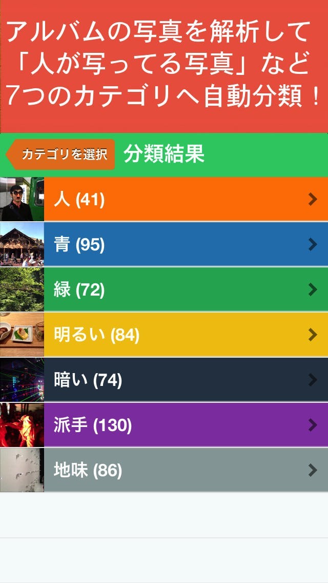 同じシーンを別角度から調子に乗って何枚も、撮影したはいいがさてどの画像をSNSに投稿しようか、不要なシーンや似たような画像は無いかと、画像同士を比較するのは大変時間の掛かる地道な作業です。クラシフィーで画像を「人、青、緑、明るい、暗い、派手、地味」と7種類の大まかなカテゴリーに自動振り分けしておけば、後のアルバム画像整理の作業も効率的に行えます。各カテゴリーの選定レベルの強弱を微調整すれば、自然の緑の中に佇む人を「人、緑」のどちらに振り分けるか選ぶ事も可能です。