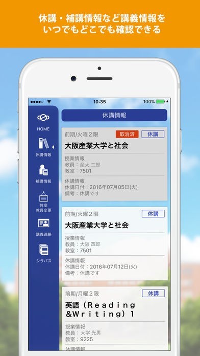 休講、補講、講義連絡、教室・教員変更など授業関連情報のチェック