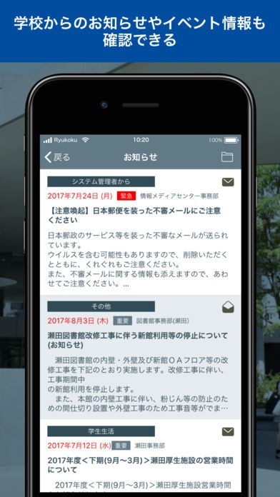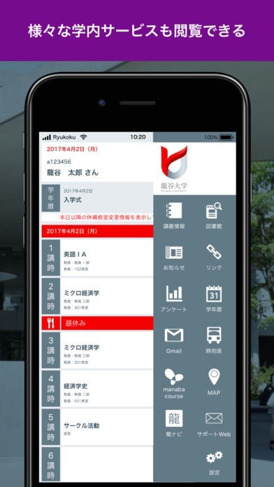 App Storeより引用龍谷大学ポータルサイトアプリは、龍大生の学生生活をサポートするためのアプリです。