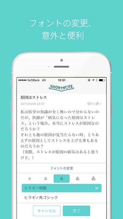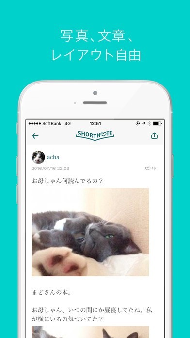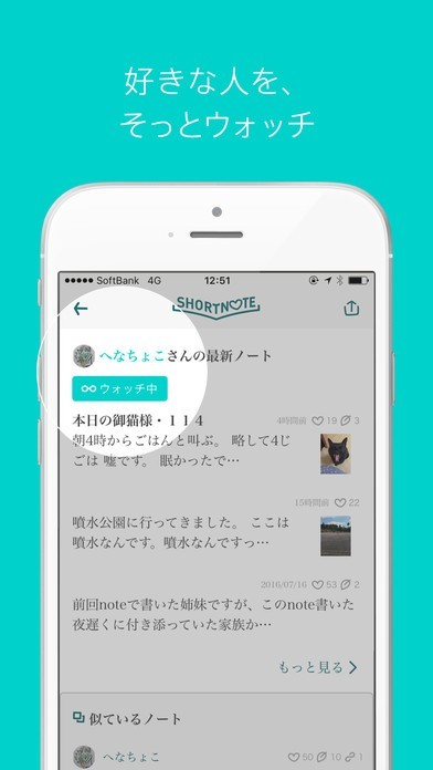 「ShortNote」では、ちょっとしたスキマ時間に読むのに最適なものを読めたり書けたりすることができます。よって、文章を書くことに興味を持っているけど、本などを書く自信がないという方が使ってみるといいでしょう。 内容はネコの一日をただ書いているような方もいれば、考えさせられるような深い内容についても書かれていたりと内容がさまざまなので、自分に合ったものを探し出して読んでみて気に入ったらハートマークをタップして応援してあげましょう。 他にはフォントを変えることが出来るので、老眼で文字が見にくいというような方の助けにもなってくれます。 加えて、「ウォッチ」を押すことによって、新着の作品が出た場合にはすぐに教えてくれて見ることが出来ますし、逆に隠すで嫌いな方の文章を見ずにすんだりもします。