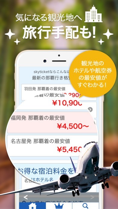 観光ガイドと航空券検索がアプリで完結。旅行計画が立てやすい!