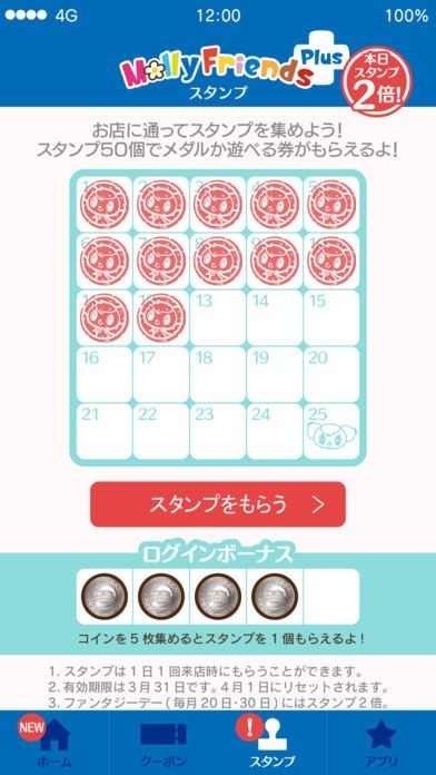 スタンプカード機能では、モーリーファンタジーに来店しカウンターの近くに設置されている機械にスマホをかざすだけでスタンプが貯まります。50個貯めるとメダルと交換できるので無料でメダルがもらえます。
