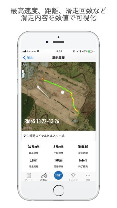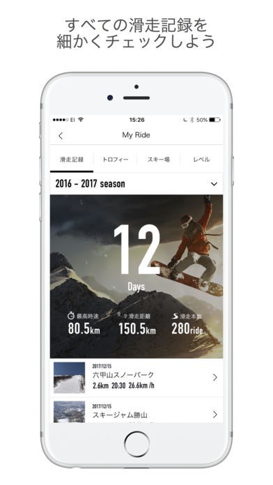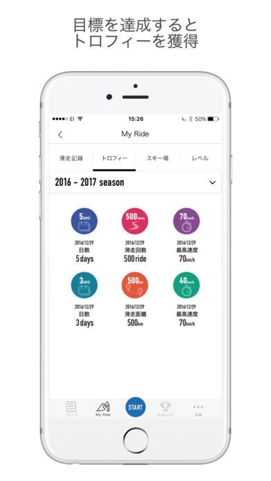 スマホの位置情報サービスを利用して自分の滑りを記録し、後から確認することができます。決められた目標をクリアするとトロフィーを手に入れることもできるので、やる気を出すことができます。