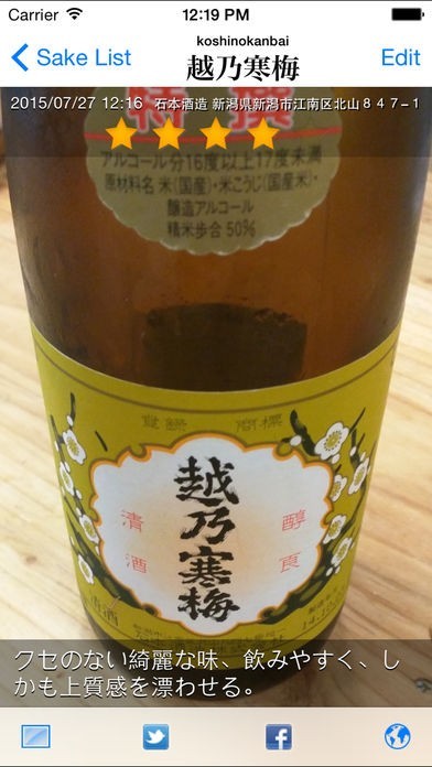 記録しておくリストには飲んだお店の名前や日本酒の味の感想などを書いておけるメモと3枚まで写真を記録しておくことができるのでお酒のラベルとかその時に一緒に飲んでいた人達を撮って記録しておくことで飲んだお酒の味を思い出しやすくできます。