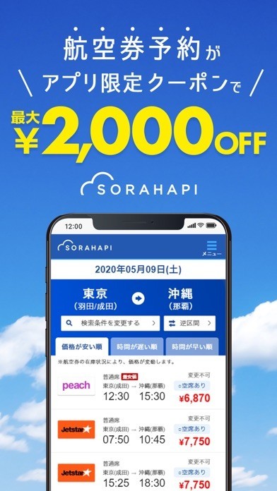 App Storeより引用ソラハピは国内の格安航空券を簡単・便利に比較・予約ができるアプリです。アプリ限定のクーポンで誰でもお得に航空券が予約できます。