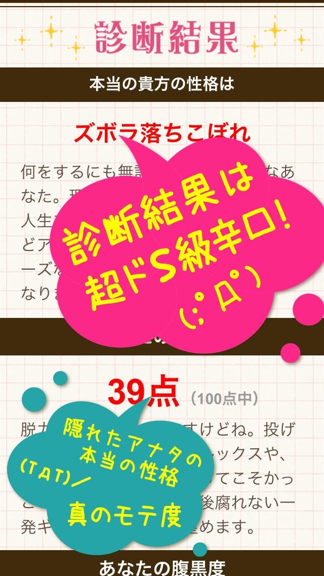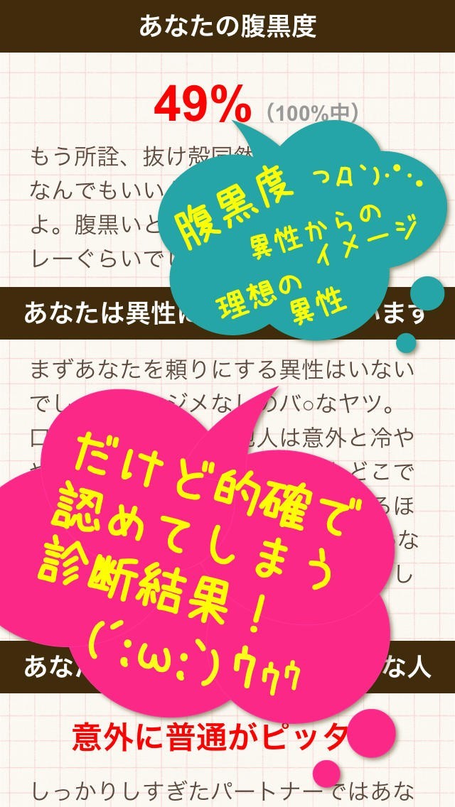 このアプリでは他のように優しい要素がなく超辛口で自分のことを教えてくれるので、ショックを受ける可能性もありますが、本当の自分を知る機会を与えてくれます。 診断できるものは「自分の本当の性格」、「モテ度」、「異性からのイメージ」、「腹黒度」です。 メチャクチャに書かれてしまうこともあるので、一人で見るよりも心を許せるお友達と一緒に試してみることで、すべてを笑い飛ばすことができるので、その使い方をするほうが向いています。 加えて、「診断結果集」によって、過去のものを見れるので、まだ見ていないお友達に自分の結果を見てもらったりもすることもできます。